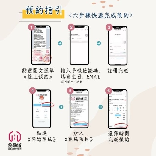 預約指引如下: 點擊下方連結加入官方LINE 點選圖文選單《線上預約》 輸入手機驗證碼、填寫生日、E-MAIL※可匿名、逆齡 註冊完成 點選《開始預約》 加入《預約項目》 選擇時間完成預約 官方LINE